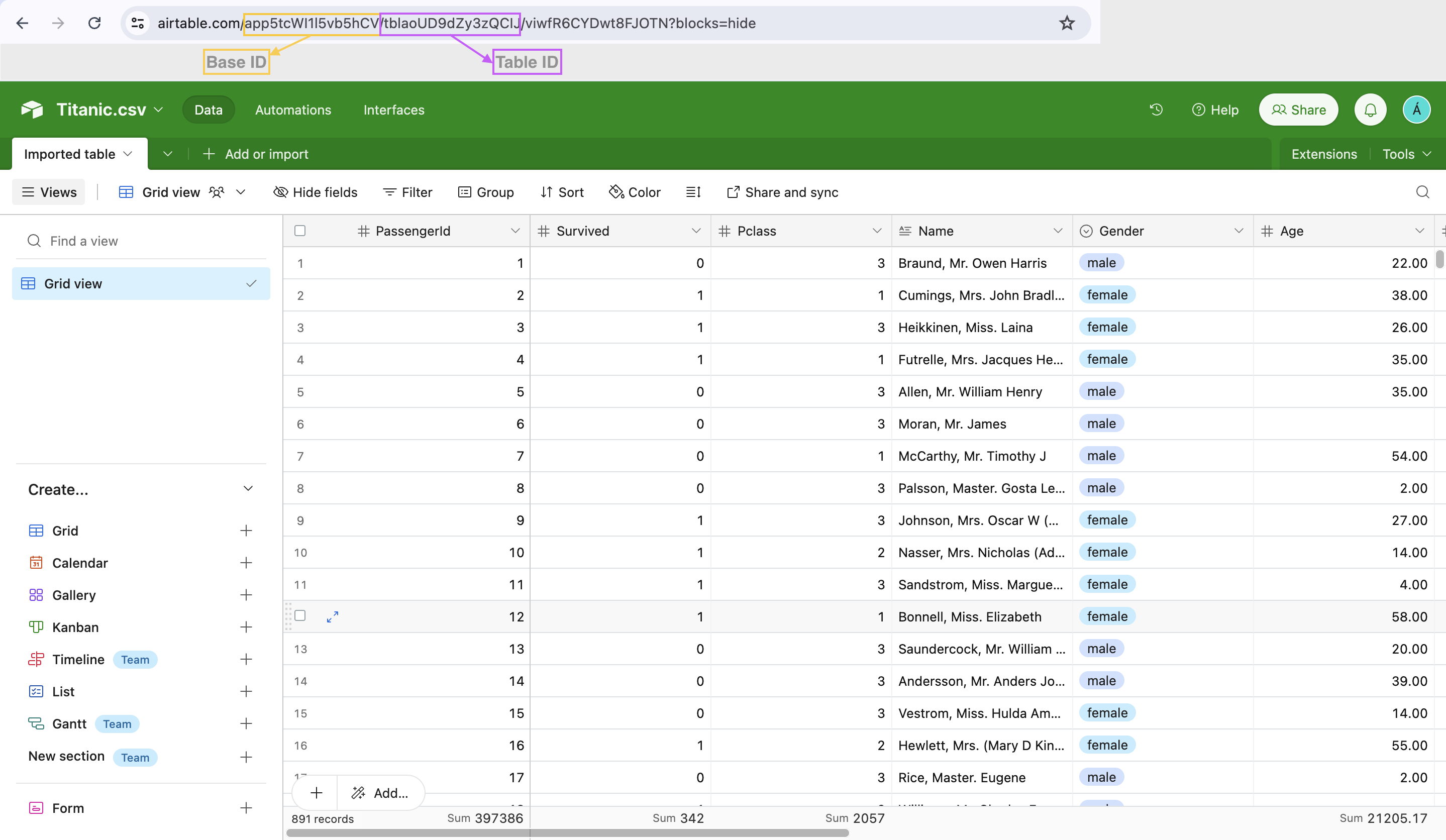 Head to your Airtable and open the dataset you want to import. From the URL you need to extract the Base ID and the Table ID