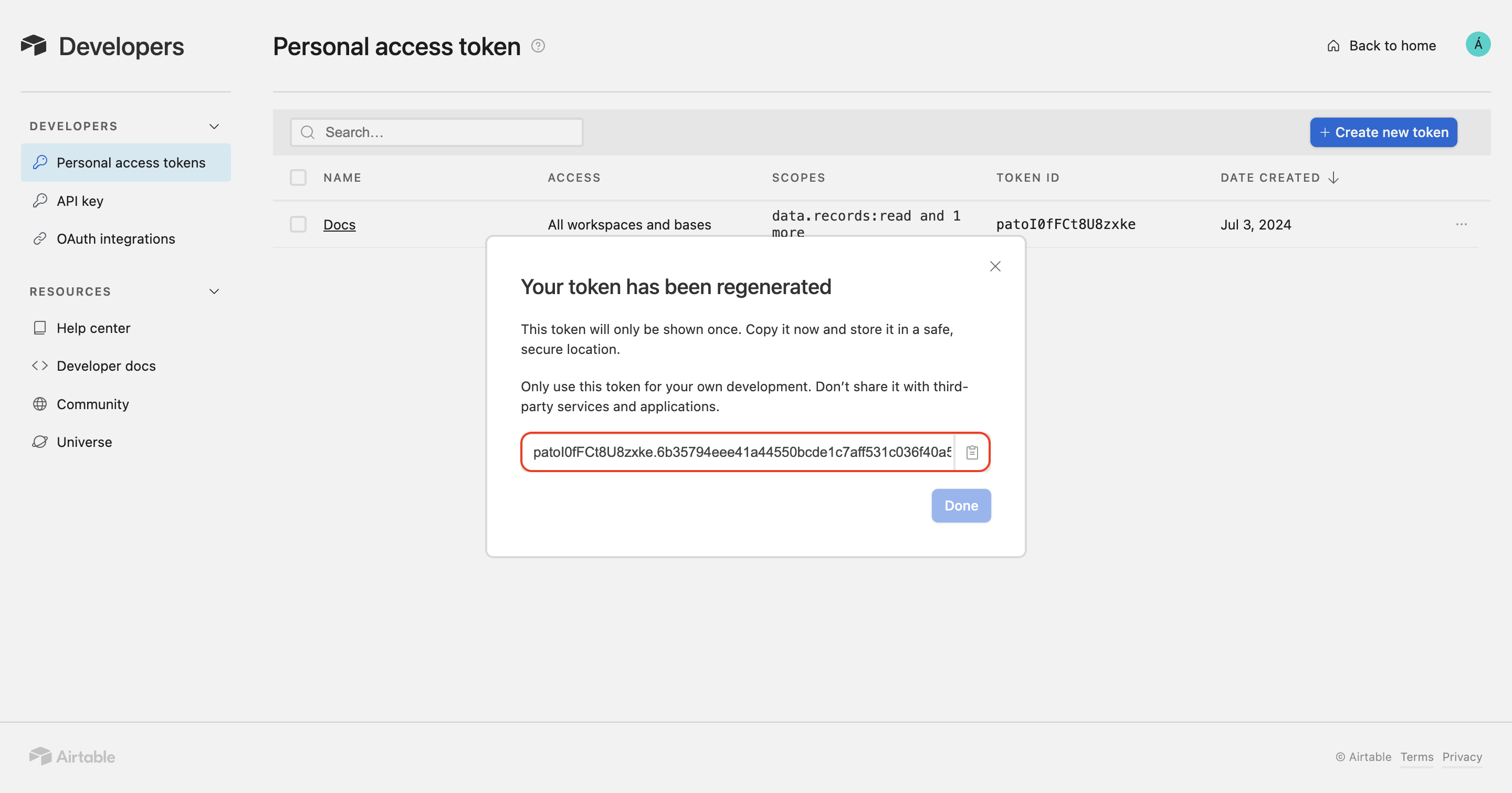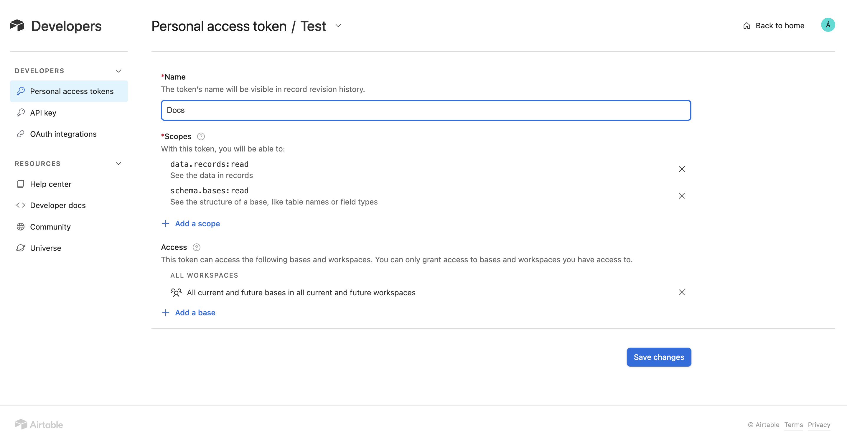 To obtain the Access Token you need to navigate to https://airtable.com/create/tokens. Click on “Create new token”, define the name the scope and the access. At least you should include the two scopes to read (data.records:read and schema.bases:read) and give access to the table you want to import