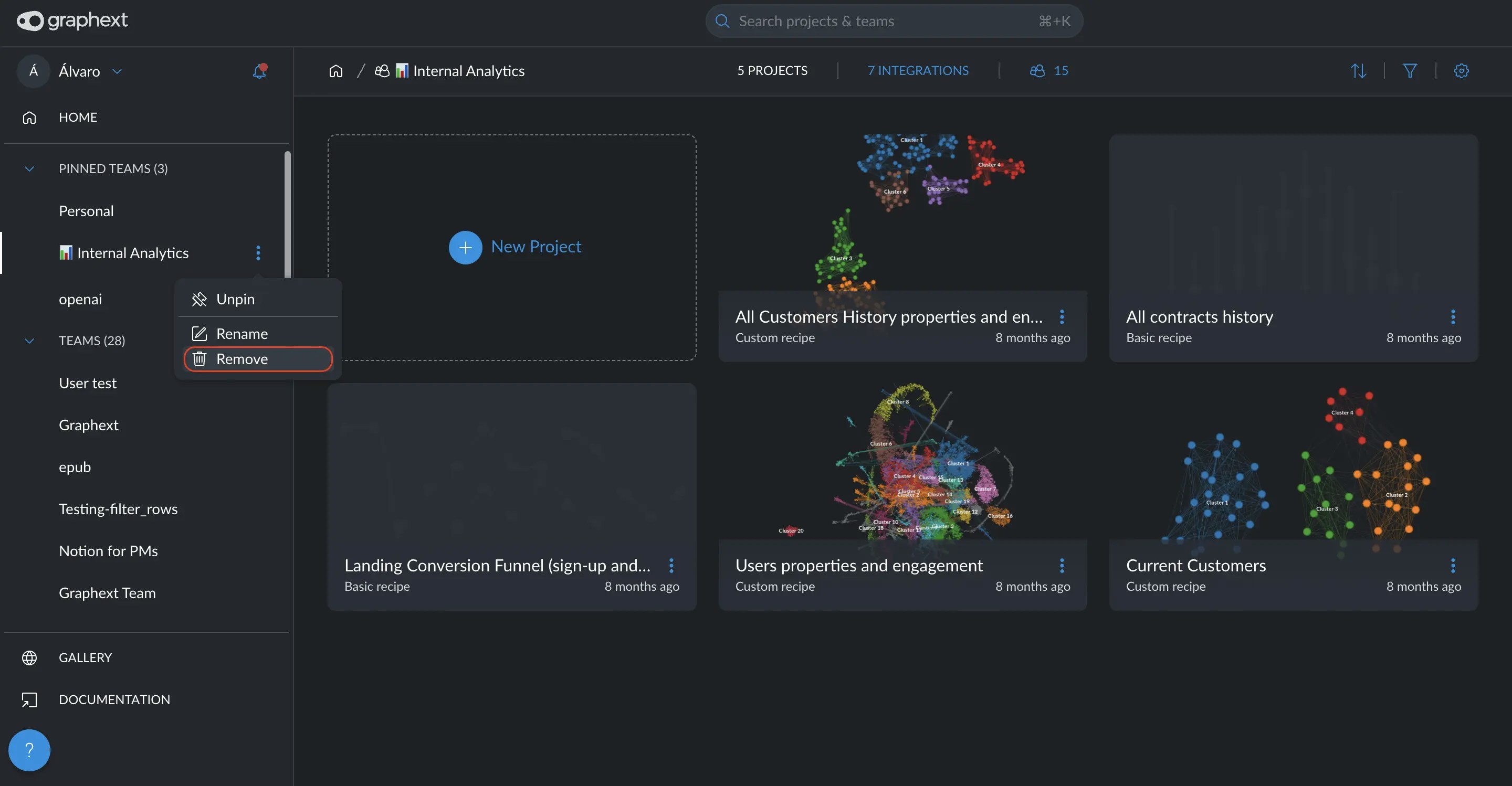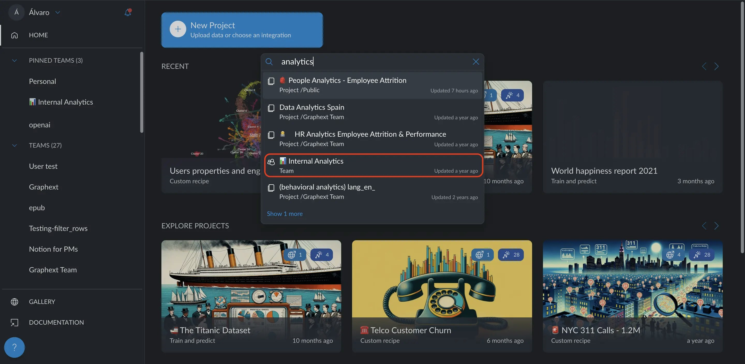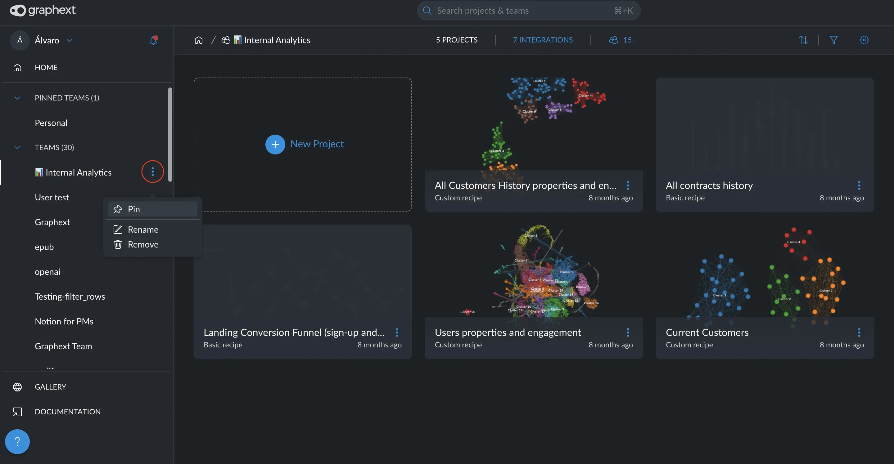 In Graphext, the functionality to pin teams is designed to streamline your workflow by making frequently visited teams more accessible. Pinning a team moves it to a dedicated section at the top of your interface, ensuring you can find and access these teams quickly, enhancing your efficiency. Here’s how you can pin a team:Guided steps
