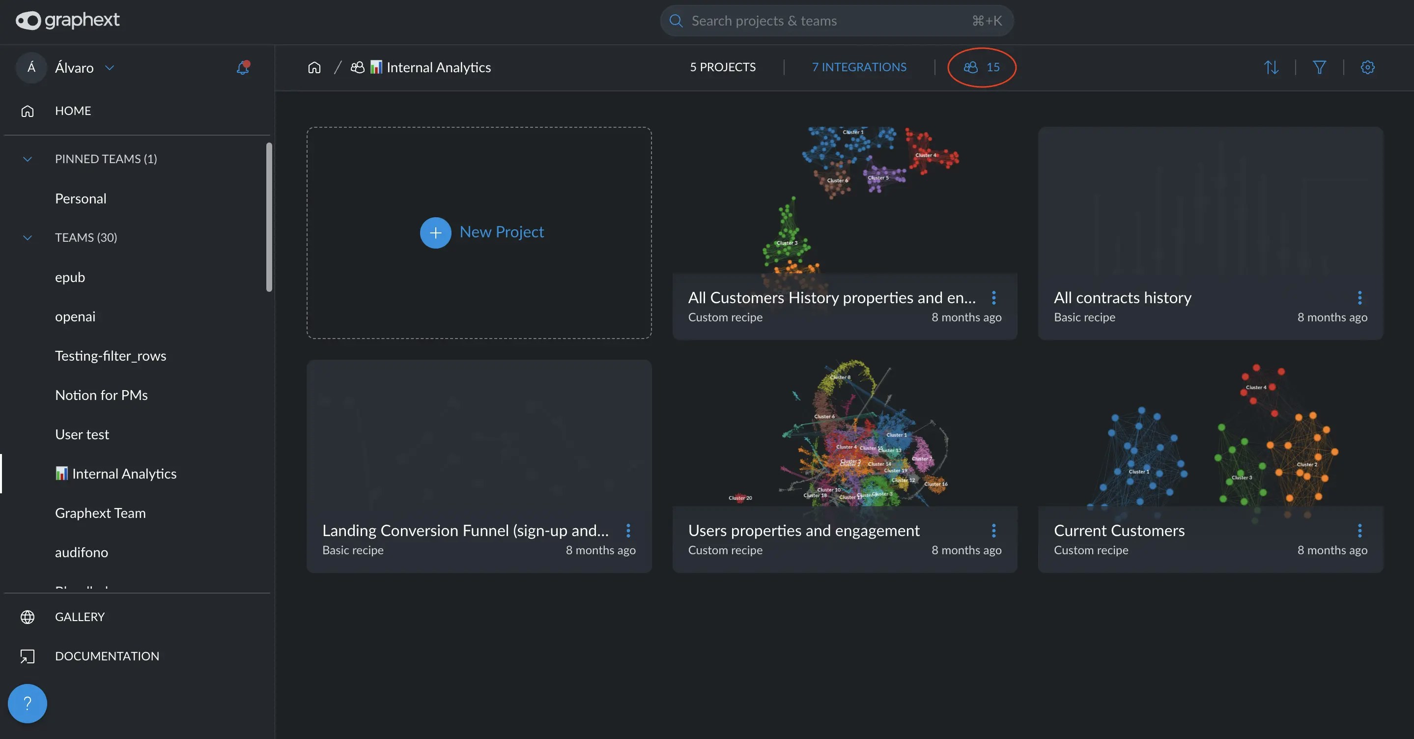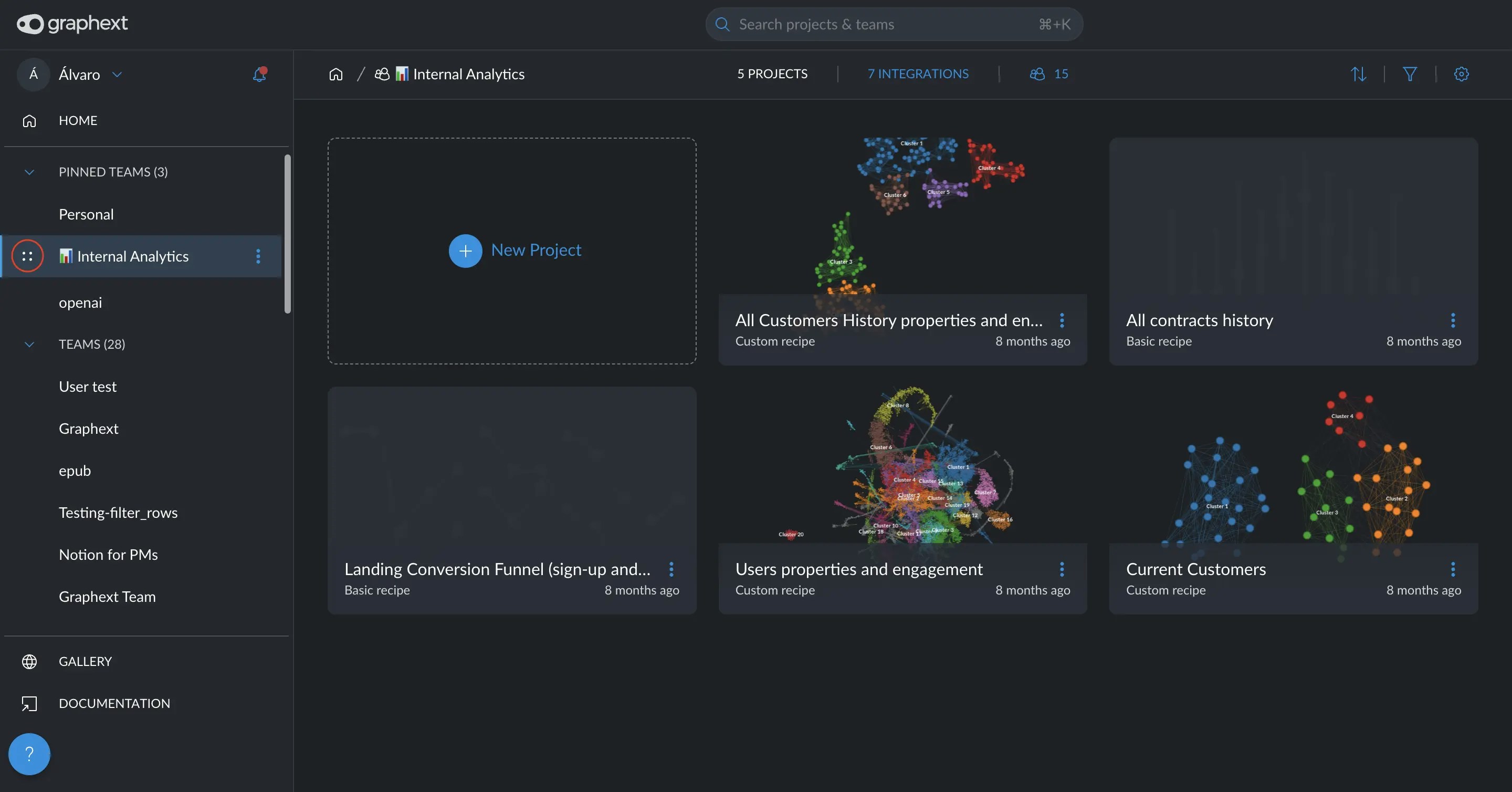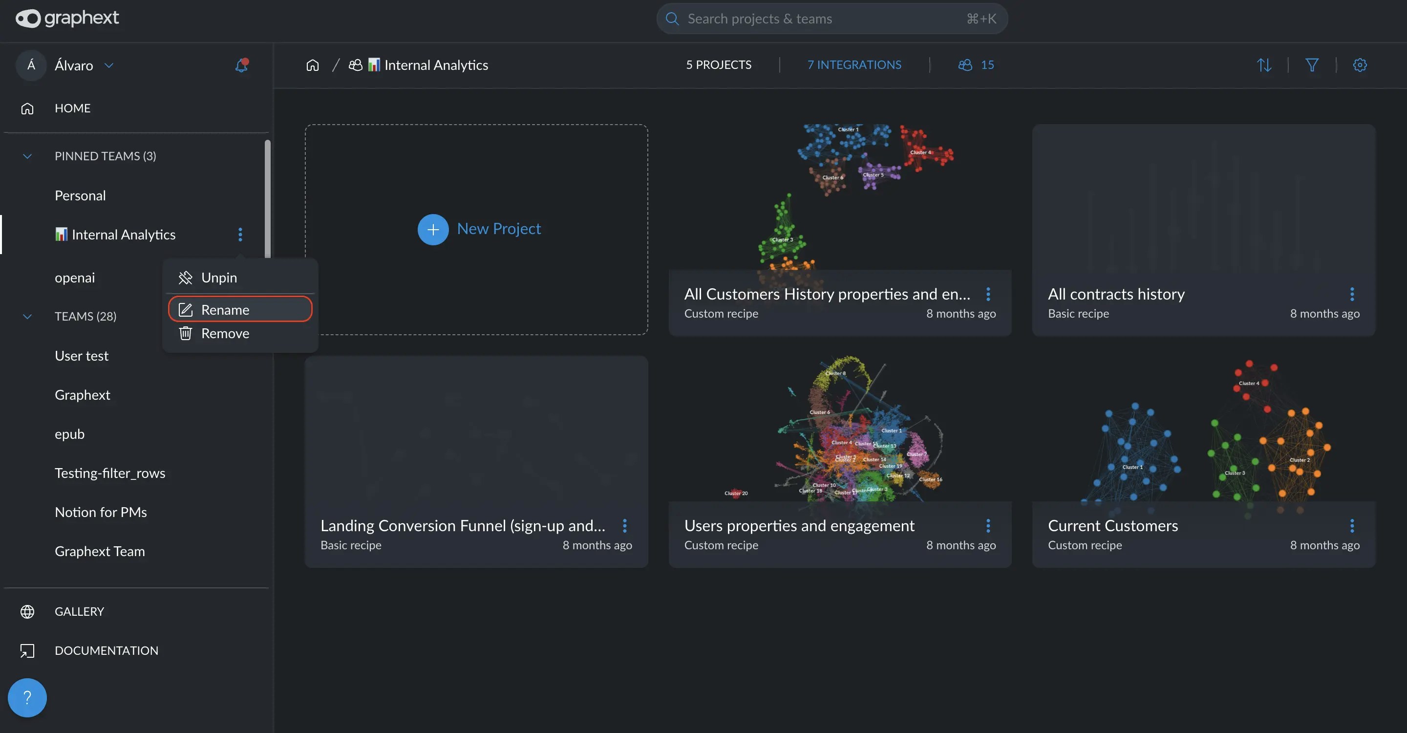 In Graphext, the functionality to pin teams is designed to streamline your workflow by making frequently visited teams more accessible. Pinning a team moves it to a dedicated section at the top of your interface, ensuring you can find and access these teams quickly, enhancing your efficiency. Here’s how you can pin a team:Guided steps