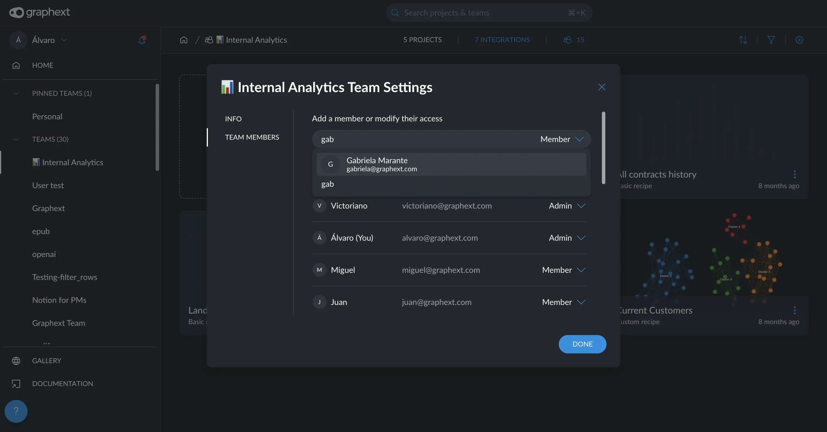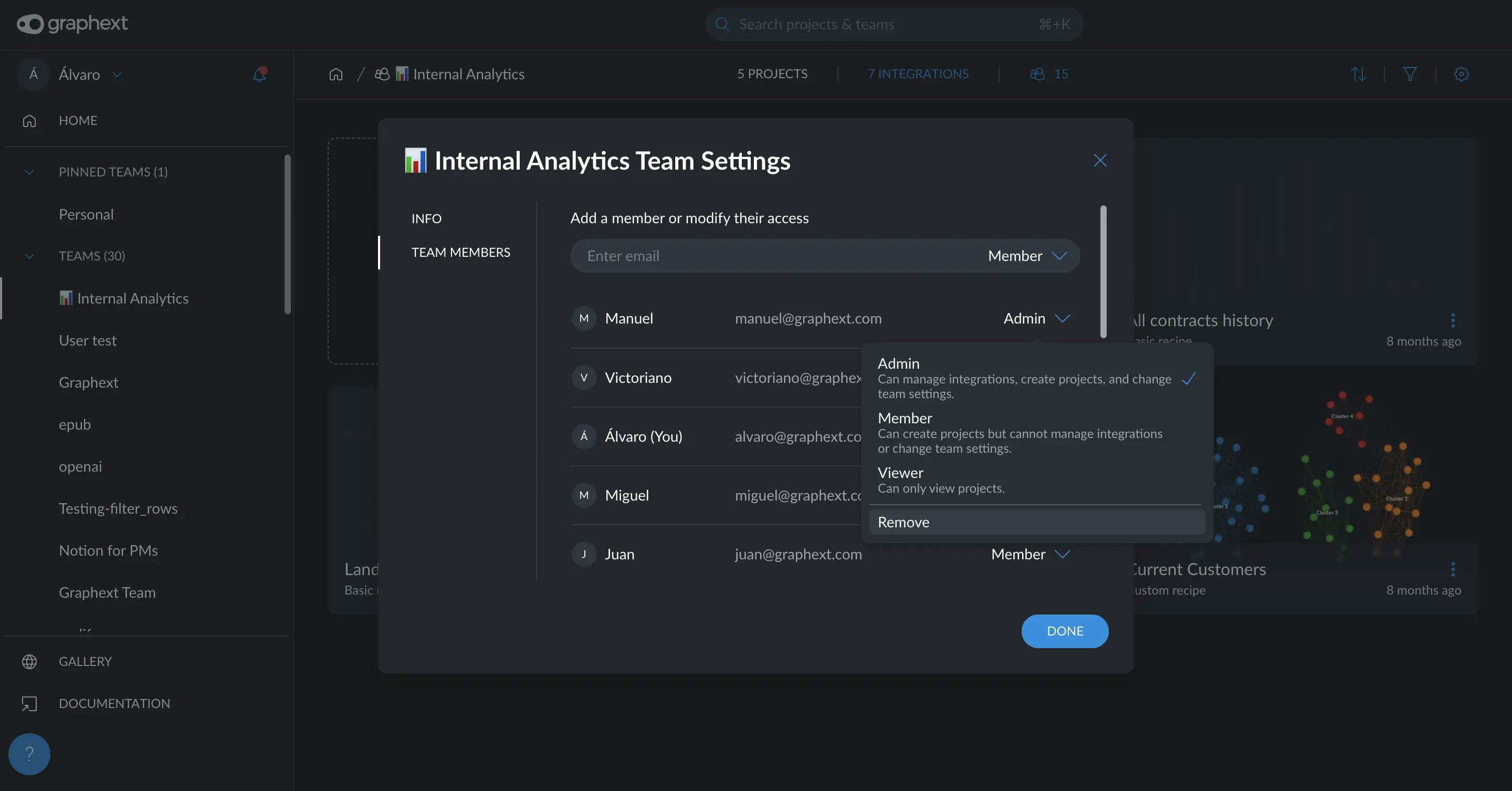 In Graphext, we have established three distinct roles to accommodate various levels of access and control within teams. These roles ensure that team members can perform their tasks effectively while maintaining necessary security and organizational standards:- Admin: As the most privileged role, Admins have comprehensive control over the team’s dynamics. They can manage integrations, create new projects, and modify team settings, allowing them to tailor the team environment to suit specific needs.